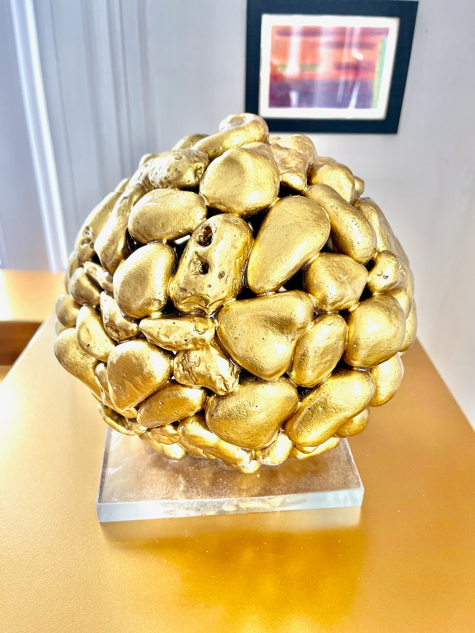 Pebbles of flint, agate, jasper, and quartz become relics of deep time, arranged into rings, relics, and planetary spheres that echo ancient votive forms. Some shimmer with gilt like offerings to unseen gods; others remain bare, their surfaces carrying the memory of currents and mineral histories.