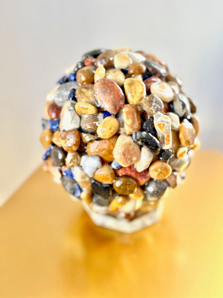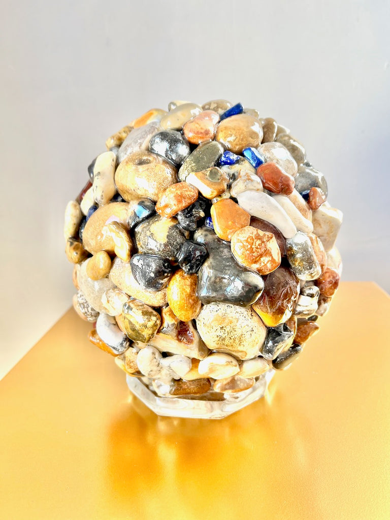A hand-formed sphere whose surface is set with pebbles gathered from the shore and fragments of lapis lazuli that pool on one side like a celestial sea. The globe combines blue lapis with red jaspers, pale quartz and agates, and dark flint and chert, forming a kind of stone map of an imagined world, where land and ocean meet in timeless dialogue.