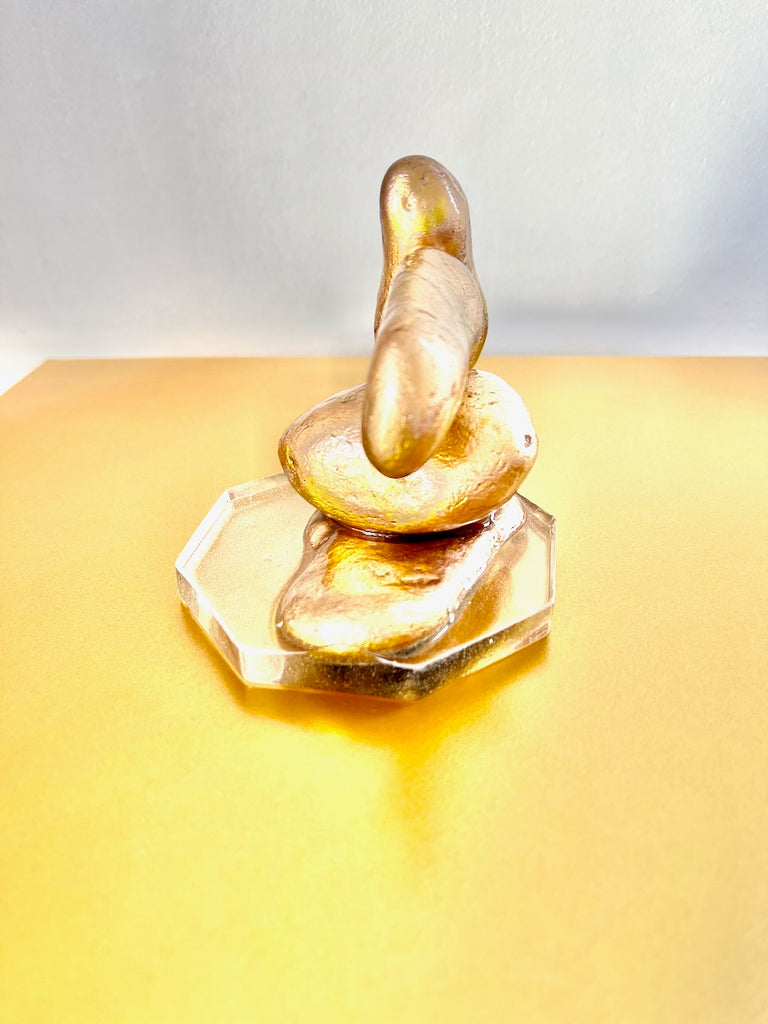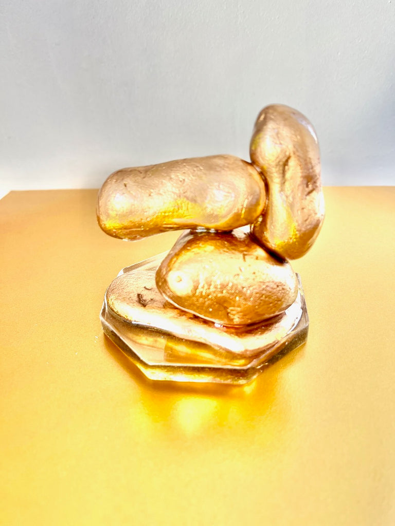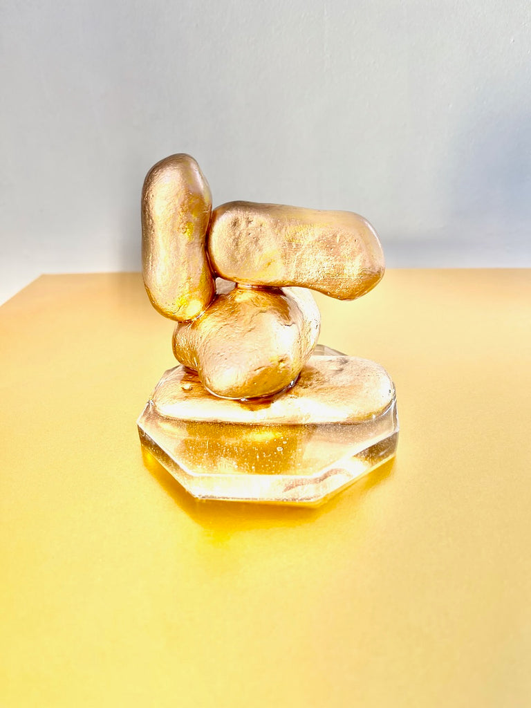 Four softly contoured pebbles are stacked in a poised formation, their curves now burnished in subtle rose-gold gilt, echoing the shimmer of late sunlight over tidal sands.