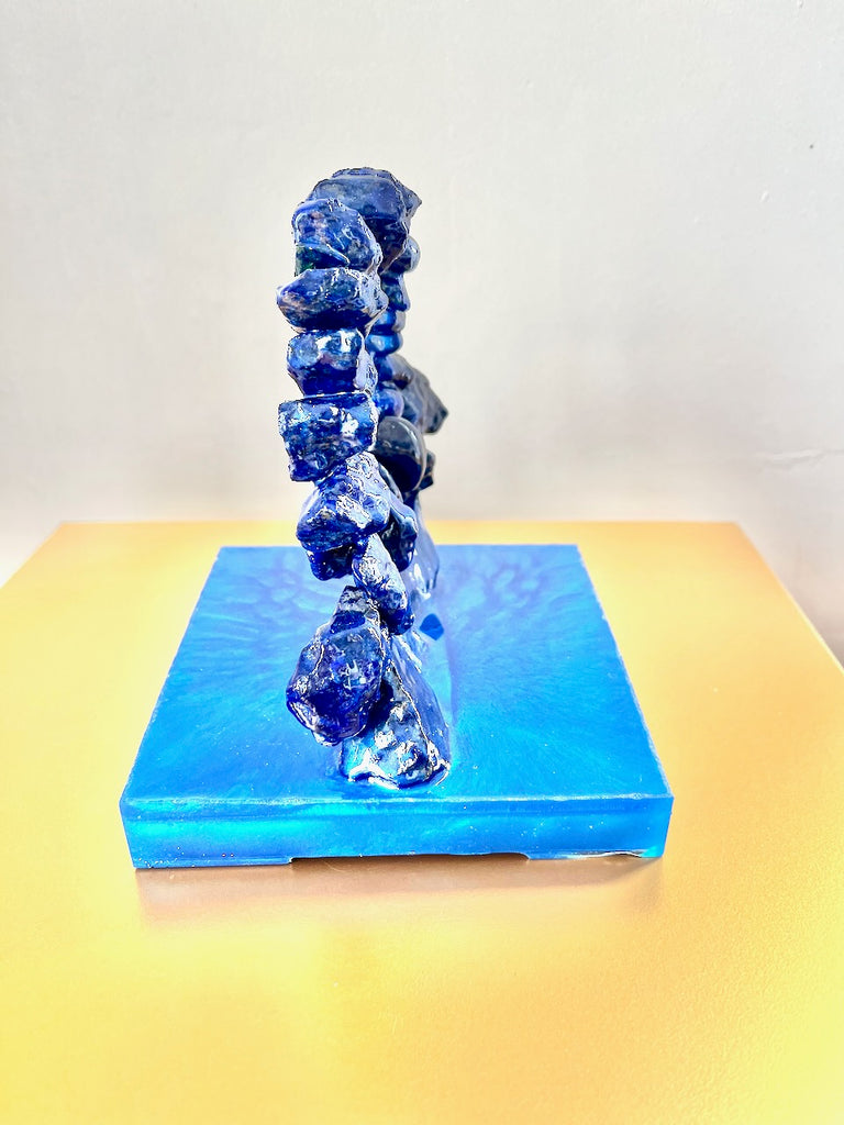 Collected along the ancient paths near Steyning, this broken ring holds the feel of riverbeds and old shorelines. The stones are left largely raw; fragments of inland sea-glass remain clear—deliberately untouched—while an azure resin pool binds the arc and casts a cool, water-like light across the piece. It reads less as ornament than as a small survivor of ritual, a marker of layered time.