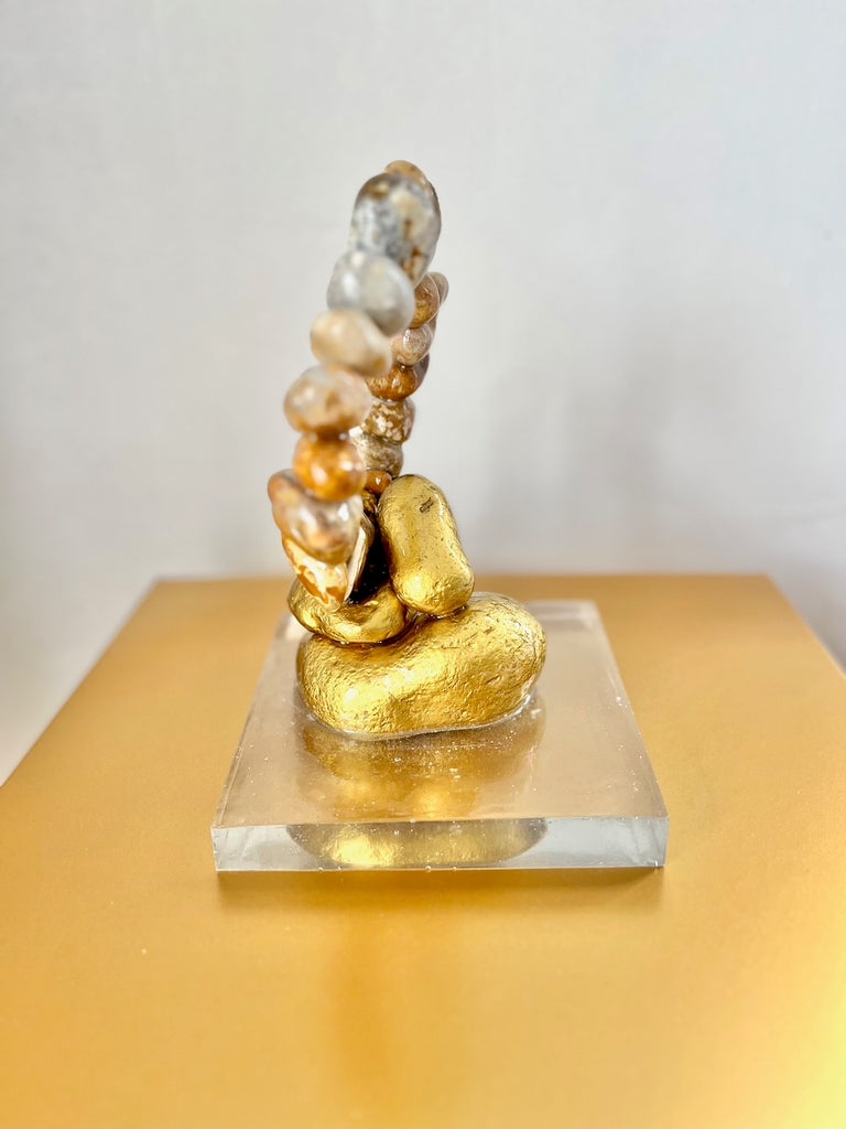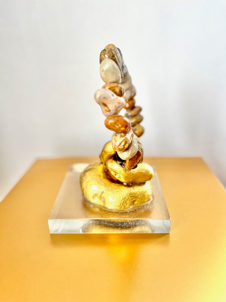This sculpture celebrates the elegance and rarity of the unbroken ring. Rising from a luminous gold-leafed base, the circular form appears weightless yet strong, as if drawn by an unseen celestial force. The stones that form the ring are rich in warm earthy colours — amber, honey, russet and pale sand — each one shaped smooth by time, carrying the memory of riverbeds and ancient shores. Together they create a glowing orbit that speaks of resilience and the harmonious cycles of nature. The piece honours the balance between fragility and strength, between earthly origins and the wonder of the skies.